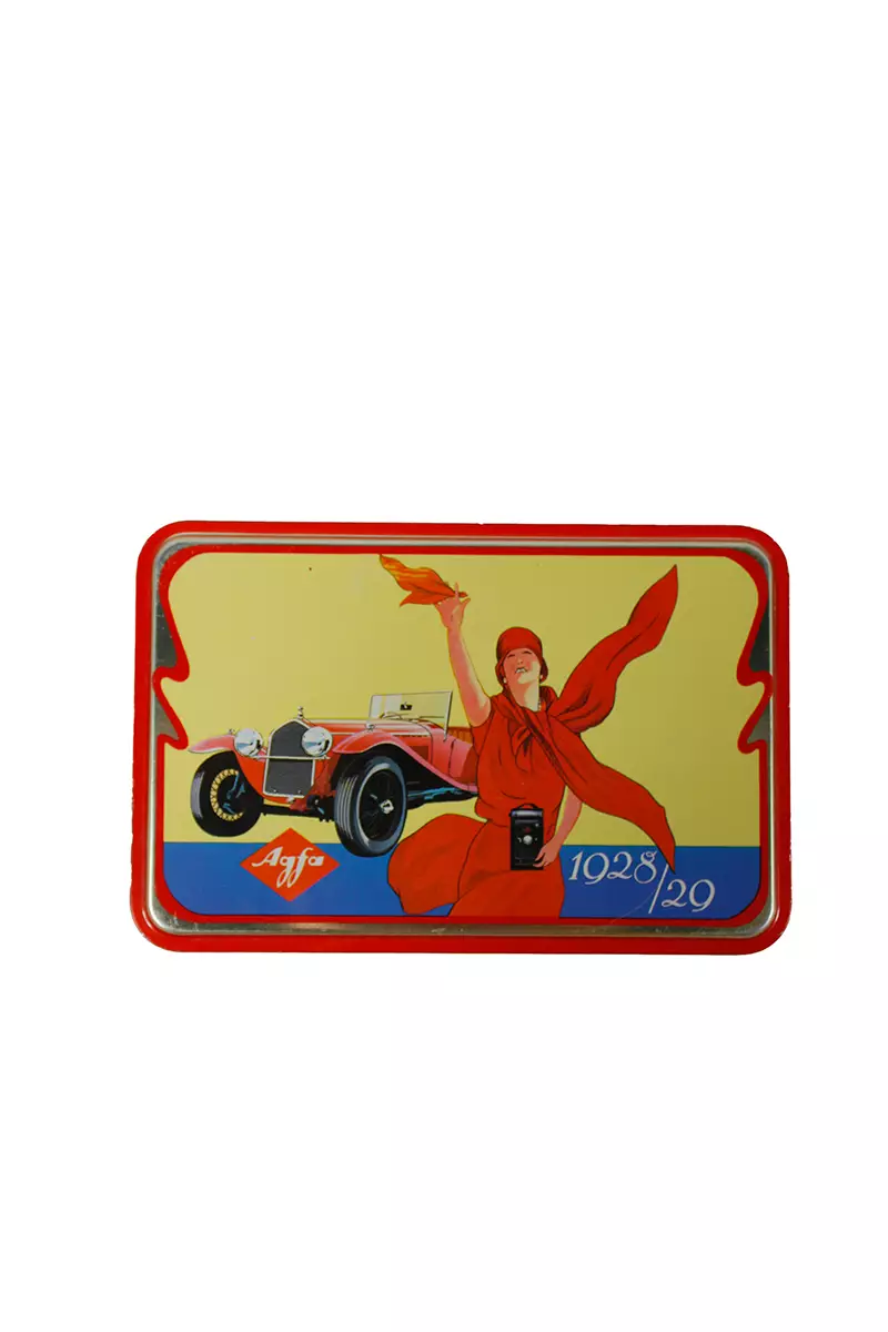 Agfa vintage-tyylinen tinarasia Desing: Kannessa on Agfa mainoskuva vuosilta 1928/29