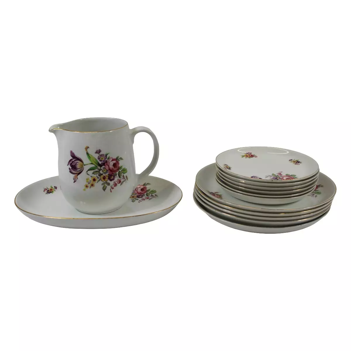 Arabian astiasto kukkakuvioilla ja kultaisin reunoin. Sisältää: 1kpl maitokannu, korkeus; 15cm 1kpl tarjoilulautanen, halkaisija: 20x28cm 6kpl pieniä lautasia, halkaisija: 16,5cm 5kpl suuria... Lue lisää