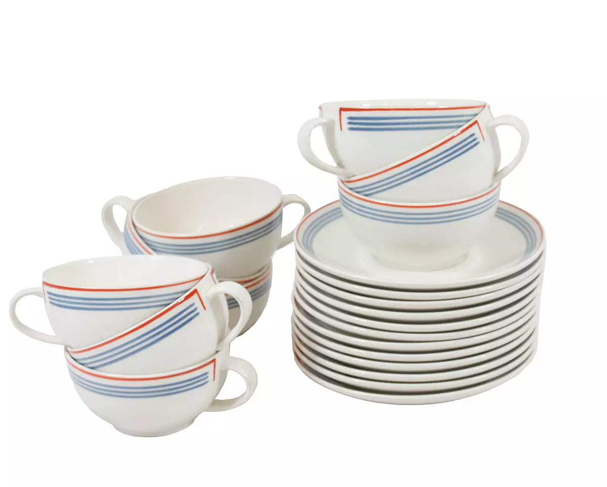 Arabia Domino Bistro, kahviastiasto Kuppeja 9kpl, halkaisija: 10cm Lautasia 12kpl, halkaisija: 16cm Kunto: Tuotteissa kulumaa