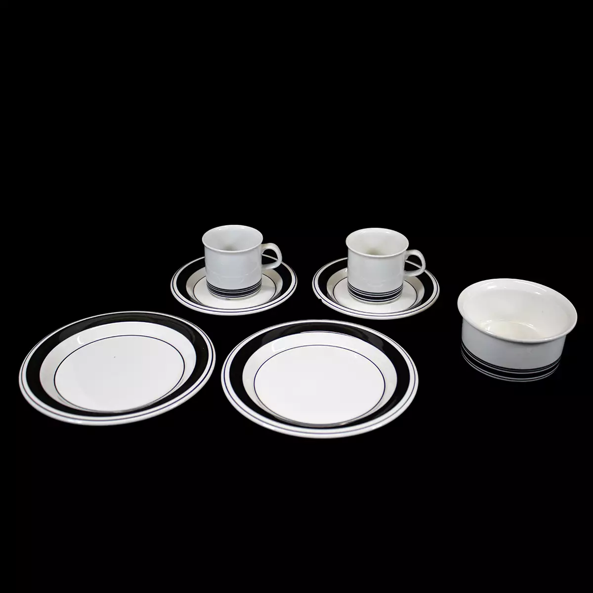 Arabia Faenza- sarjan astiastoa Setti sisältää: -2kpl mokkakuppeja, halkaisija: n.6.5cm, korkeus: n.6cm -2kpl aluslautasia, halkaisija: 13cm -2kpl kakkulautasia, halkaisija: 17cm -1kpl sokerikko... Lue lisää