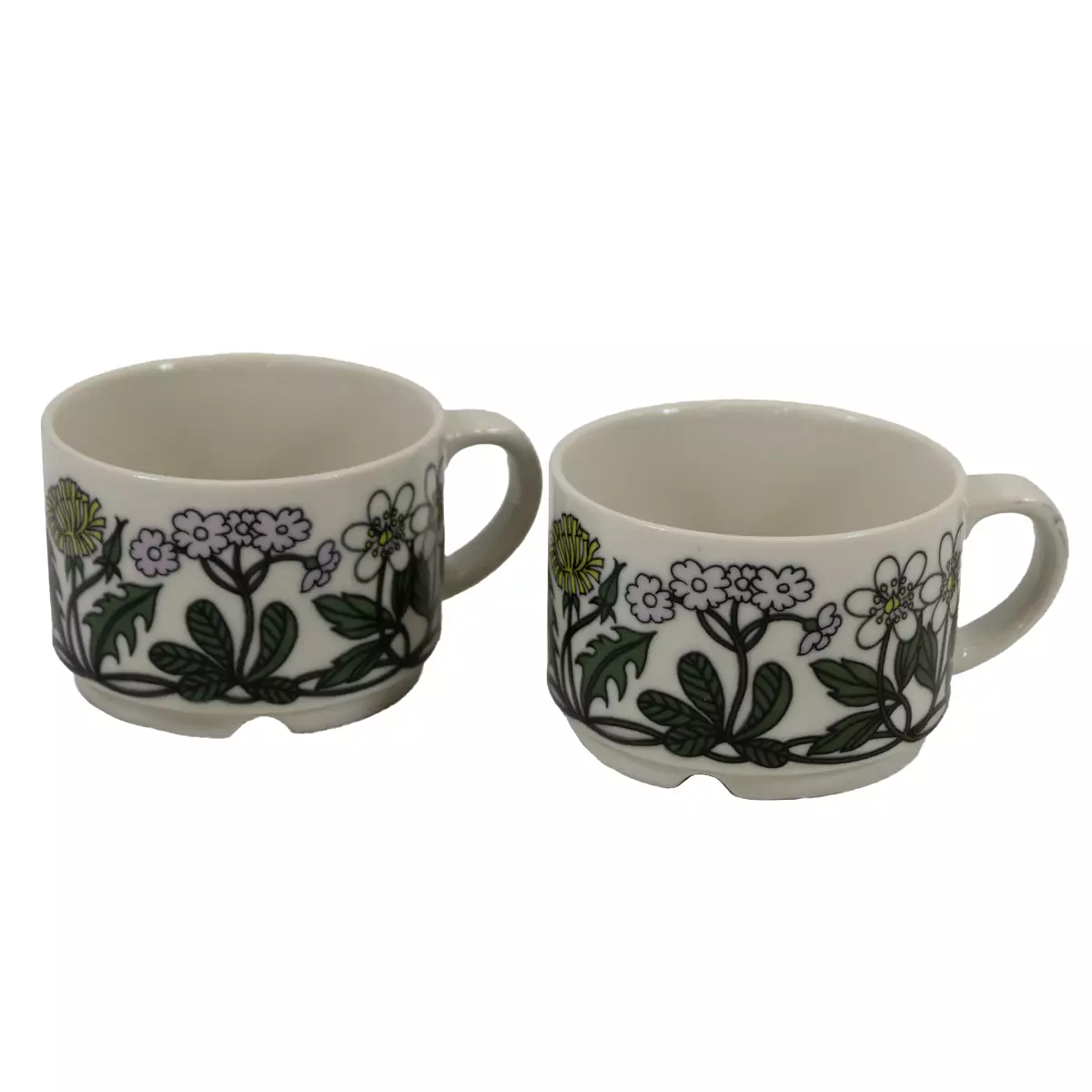 Arabia Flora -sarjan kahvikupit Koristeen suunnitellut Esteri Tomula. Muodon suunnittelija Göran Bäck. Korkeus 5,5cm. Halkaisija 7,5cm.