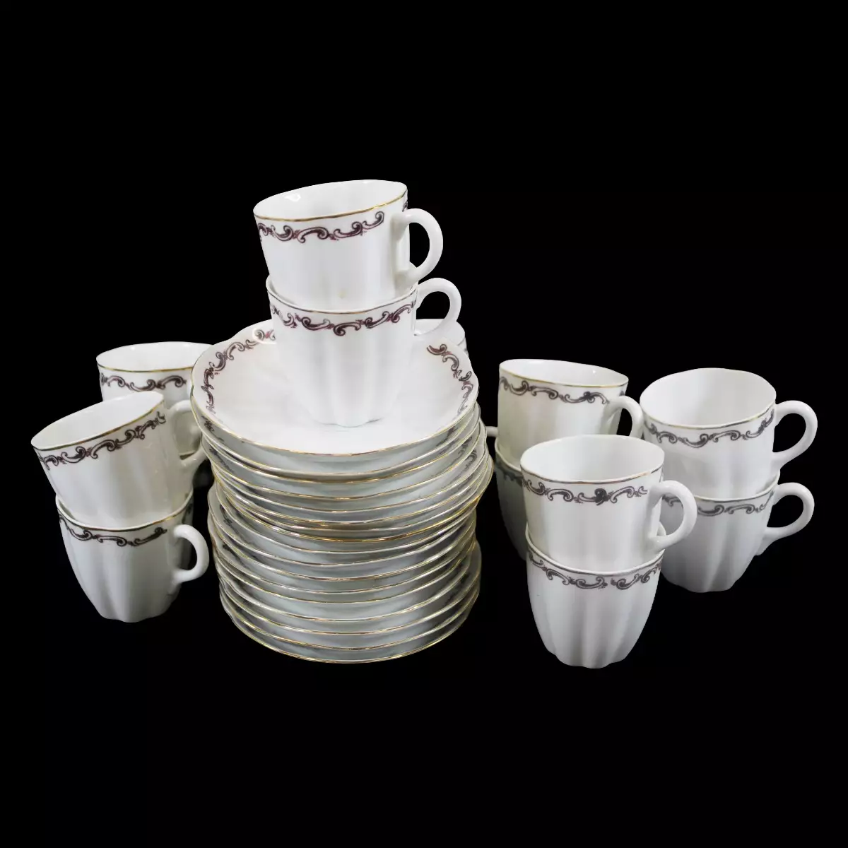 Arabia vihreä kranssi kahvi astiasto. 17 asetinlautasta Halkaisija: 13,5cm 14 Kahvikuppia Halkaisija: 7cm Korkeus: 6cm