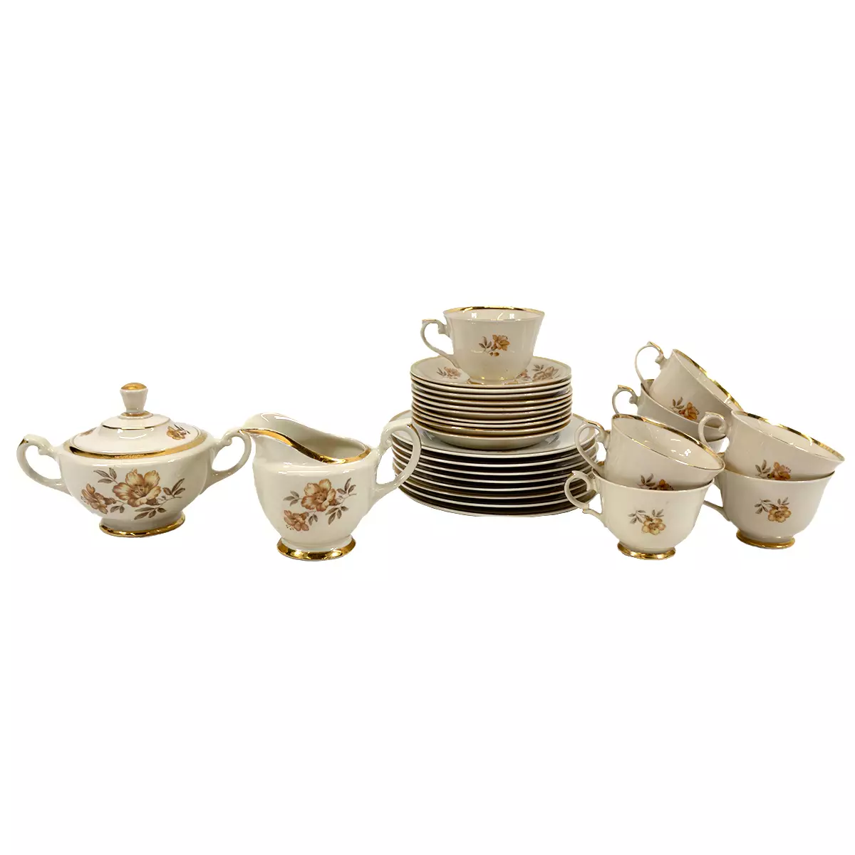 Arabian Myrna- astiastoa. Kuppeja 8 kappaletta - Korkeus: n. 6cm, Halkaisija: 8,5cm. Pullalautasia 8 kappaletta - Halkaisija: n. 17cm. Kahvikupin aluslautasia 10 kappaletta - Halkaisija: 13,5cm.... Lue lisää