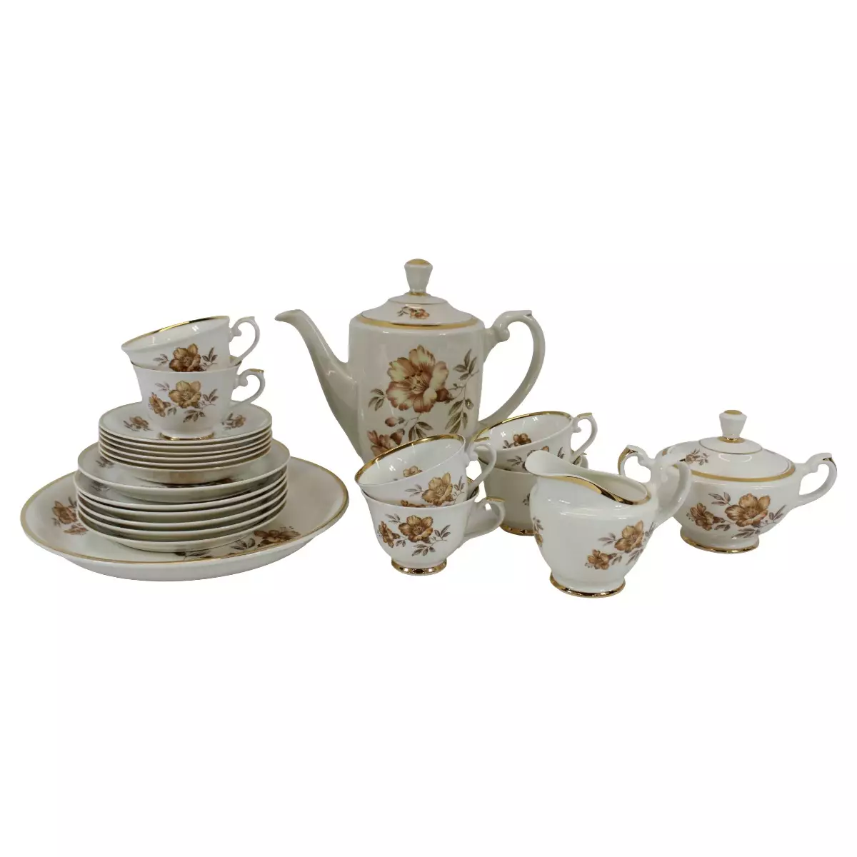 Kuppeja: 6kpl - Korkeus: 6,5cm, Halkaisija: 8,5cm Kahvikupin aluslautasia: 6kpl - Halkaisija: 13,5cm Kakkulautasia: 6kpl - Halkaisija: 16,5cm Iso tarjoilulautanen: 1kpl - Halkaisija: 25,5cm Sokerikko:... Lue lisää