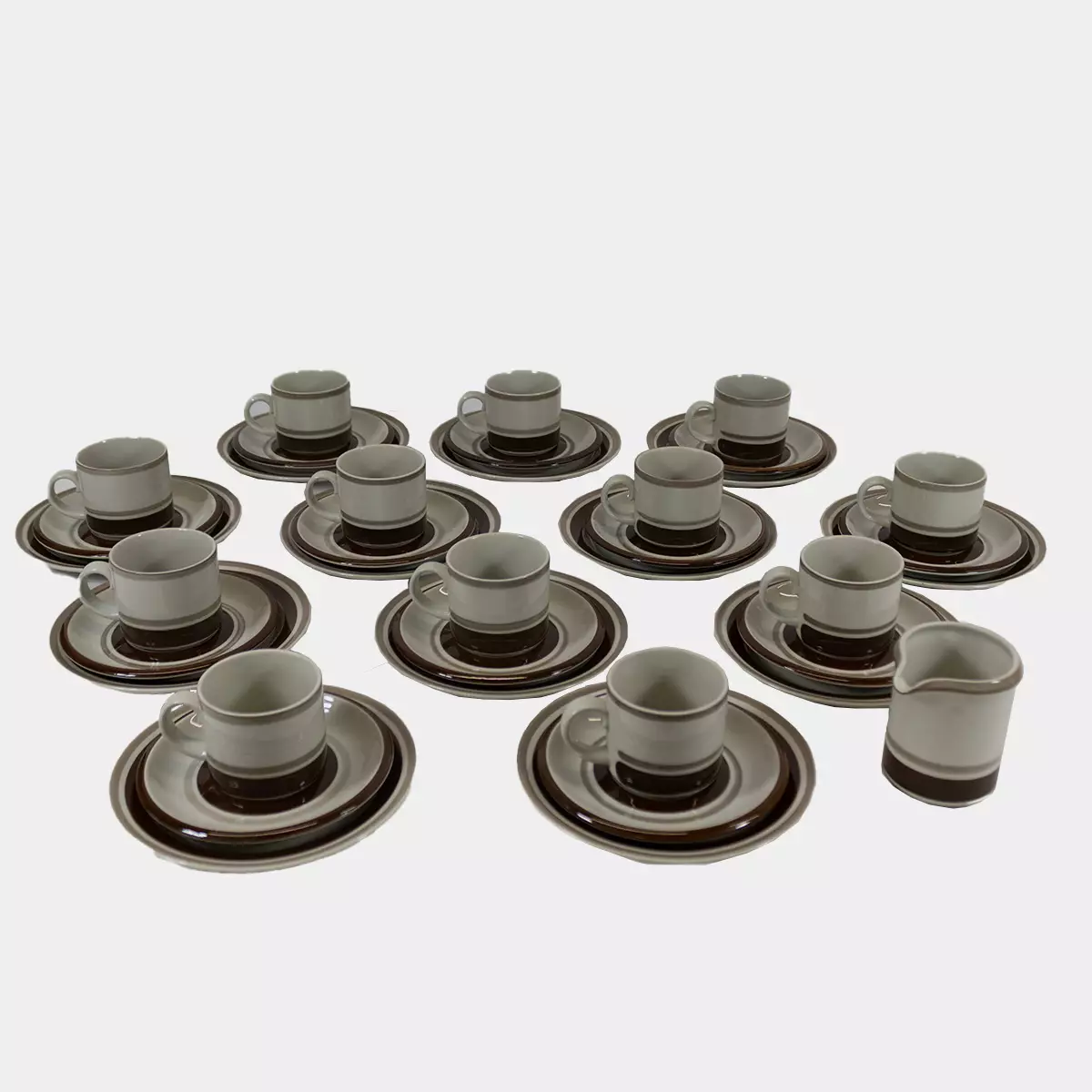 Arabia Pirtti sarjan astiasto Sisältää: -12kpl kahvikuppeja -12kpl kakkulautasia, halkaisija: 17cm -12kpl asetteja, halkaisija: 14cm -1kpl kermakko