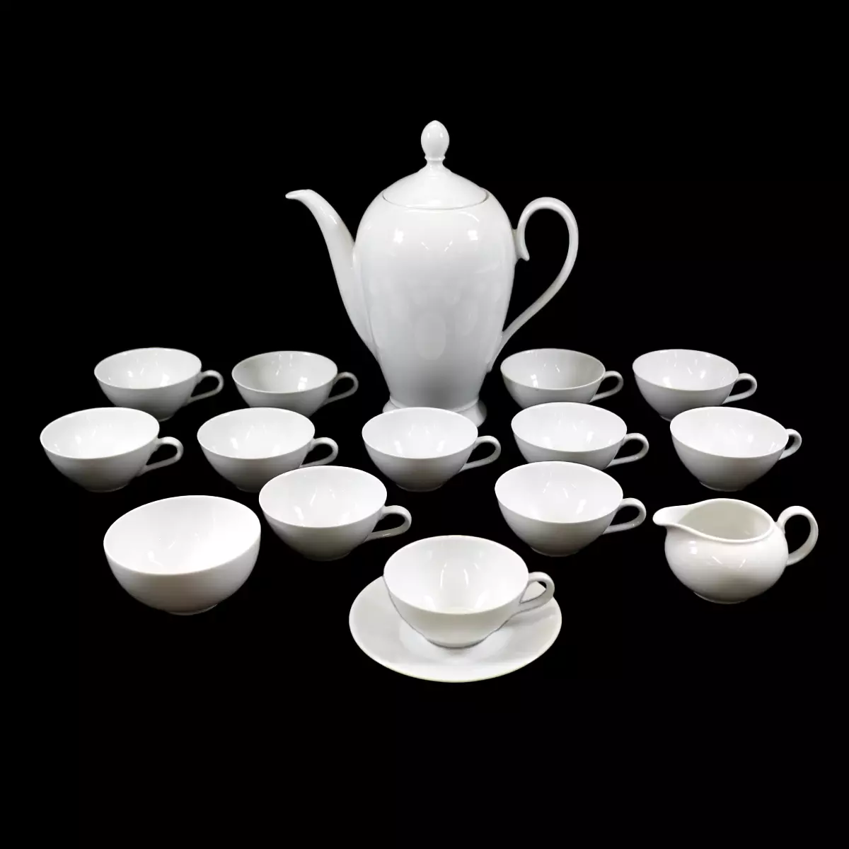 Saksalainen kahviastiasto koottu kahdesta eri sarjasta (Welden ja Creidlitz) -12kpl kuppeja, korkeus n.4cm ja halkaisija n.8,5cm -12kpl asetteja -12kpl jälkiruoka lautasia -Sokerikko -Kermakko... Lue lisää