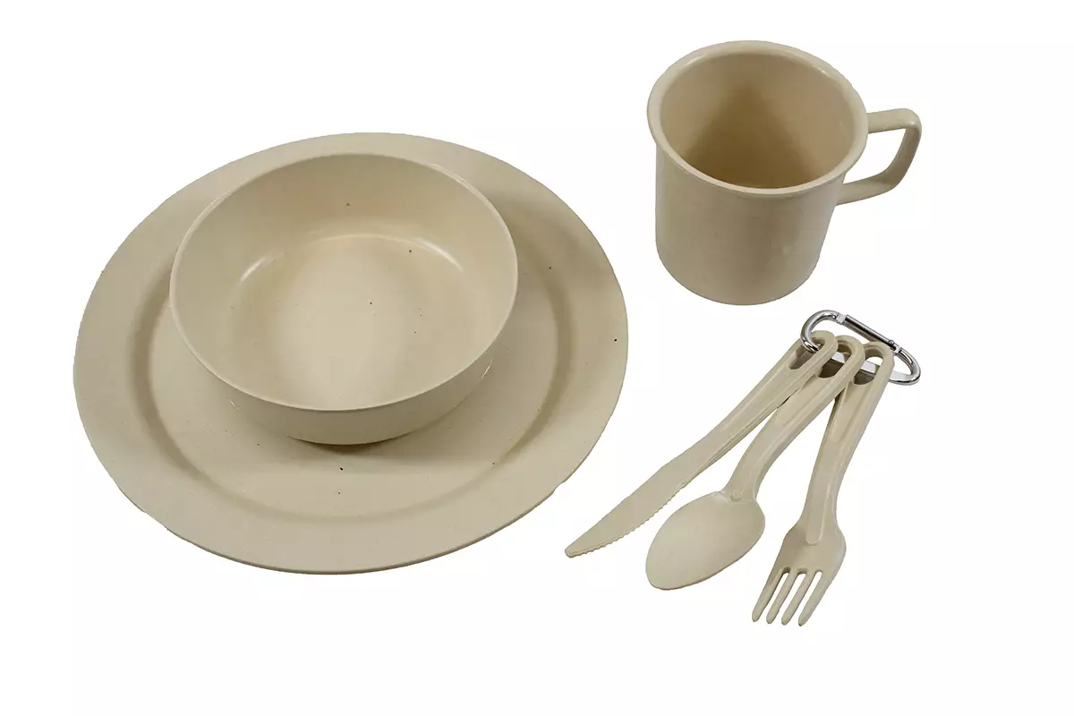 EcoSouLife-astiasetti Sisältää: matala lautanen, syvä lautanen, muki, haarukka, veitsi, lusikka, säilytyspussukka