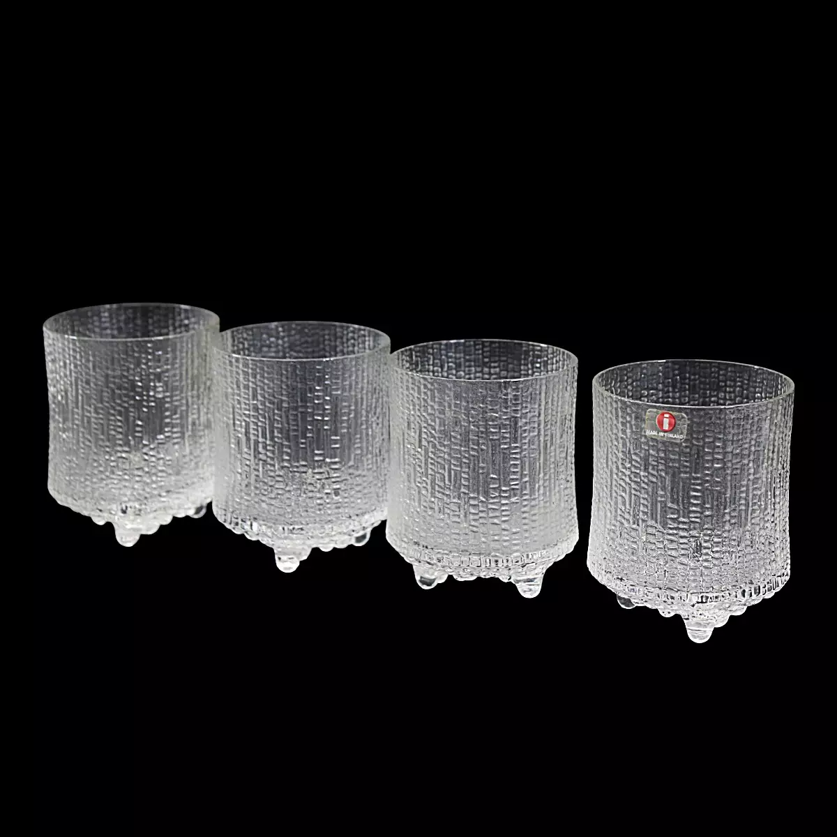 -20cl juomalasit -Suunnittelija: Tapio Wirkkala, vuosi 1968 -Valmistaja: Iittala -Korkeus: 8cm -Halkaisija: 7cm -Kunto: Hyvä, yhdessä lasissa tarra paikoillaan