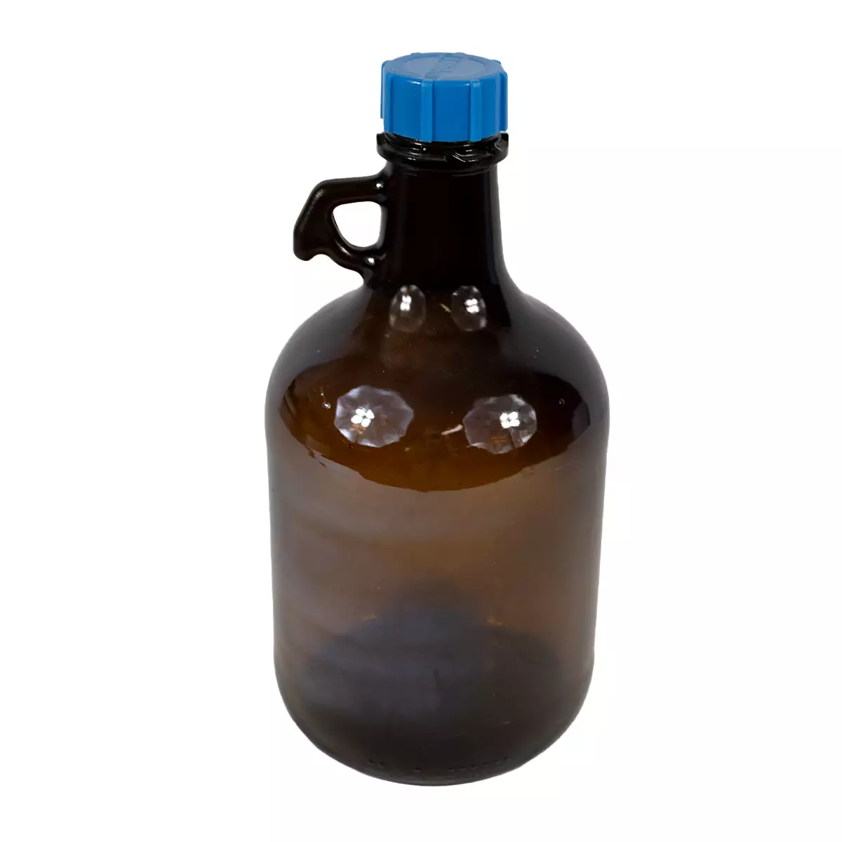 Ruskea lasipullo, jossa kahva ja sininen muovikorkki