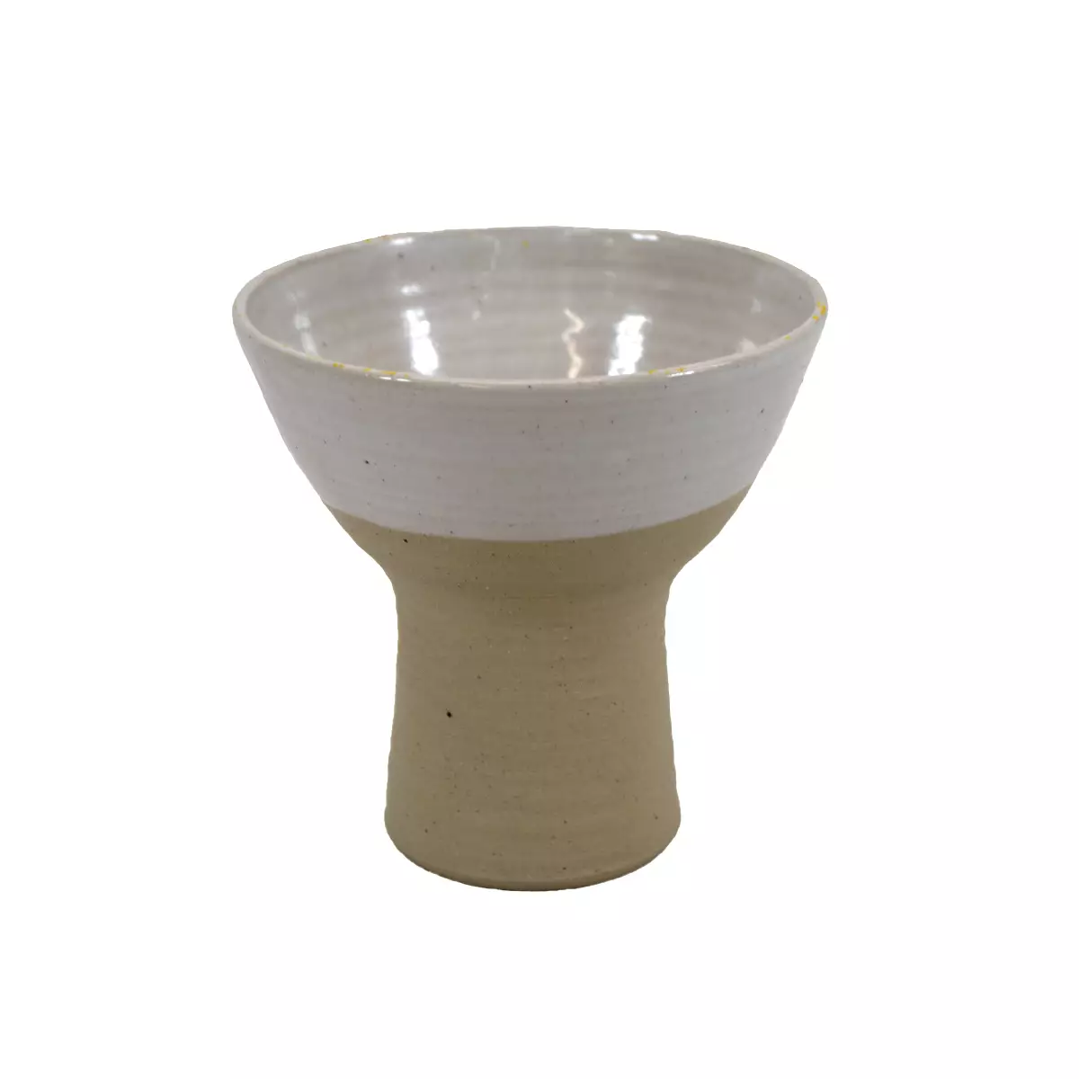 Käsintehty keraaminen kulho jalalla Valkoinen lasitettu sisäpinta ja yläreuna Lasittamaton, luonnollisen värinen savi jalkaosa Jalassa pieni, leimattu merkki. Mahdollisesti tekijän tunnus... Lue lisää