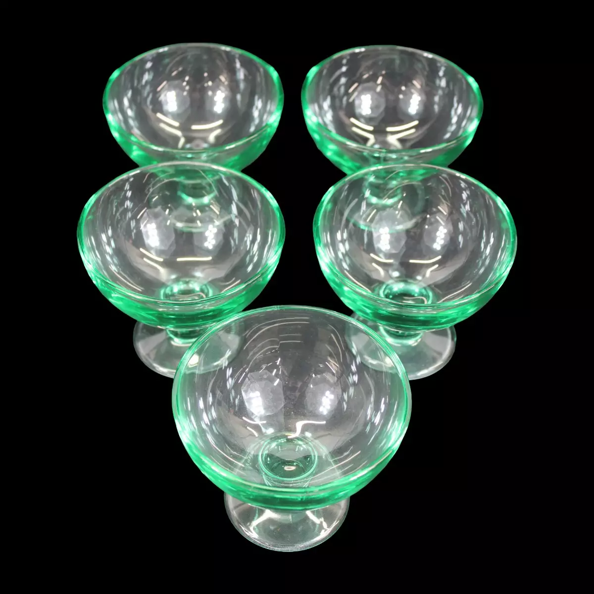 Jälkiruokamaljat Iittala, 5 kpl Verna mallia. Suunnittelija: Kerttu Nurminen Väri: vihreä Halkaisija: 11 cm Korkeus: 9cm