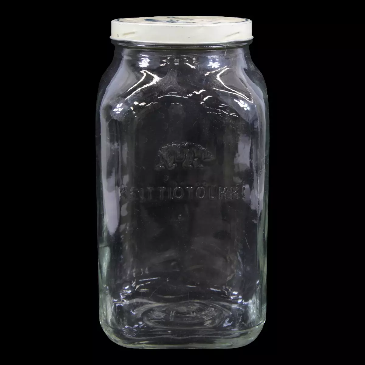 Korkeus: 30cm Pohja halkaisija: 14cm, päältä: 12cm 5L purkki Kunto: Pohjassa naarmua ja kulumaa Väri/materiaali: kirkas, lasi