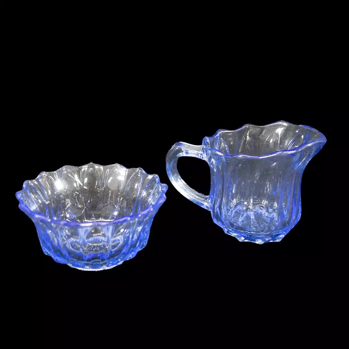 Karhulan lasin sokerikko ja kermakko Kermakko- Halkaisija: 8cm Korkeus: 7,5cm Sokerikko- Halkaisija: 9,5cm Korkeus: 4,5cm Väri: Sininen Kunto: Hyvä