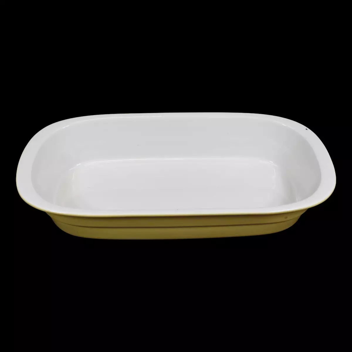 Keltainen kermasavi uunivuoka Pituus: 40cm Reunoilla hieman tummentumaa, muuten kunto hyvä.