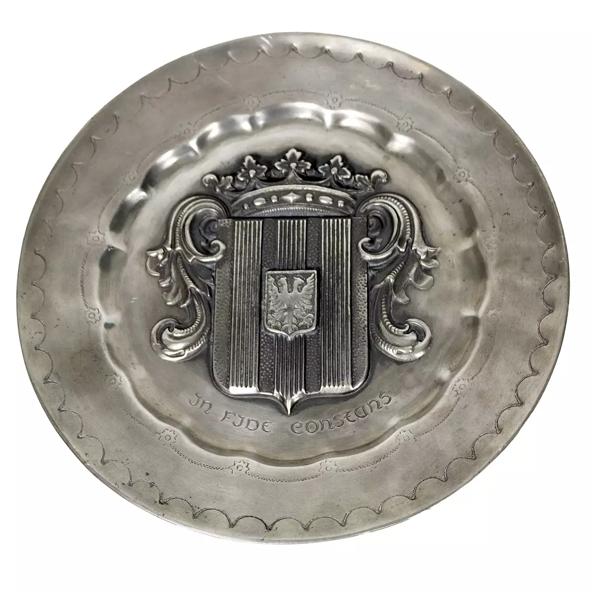 Metallinen koristelautanen Teksti "In fide constans" on latinaa ja tarkoittaa "Uskossa vakaa" Halkaisija: 30cm