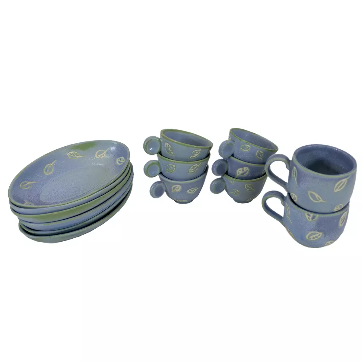 Kuopiolaista keramiikkaa 6 lautasta, 2 isoa kuppia, ja 6 pientä kuppia. Tekijä: Sylvi Lindström Mitat: Lautaset: 16 cm x 10 cm Isot kupit: korkeus 6 cm, halkaisija noin 7 cm Pienet kupit: Korkeus 5... Lue lisää