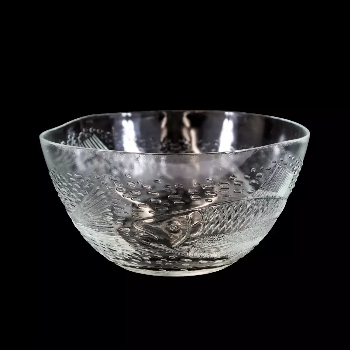 Lasikulhossa kohokuvioituja kaloja ja pisaroita.