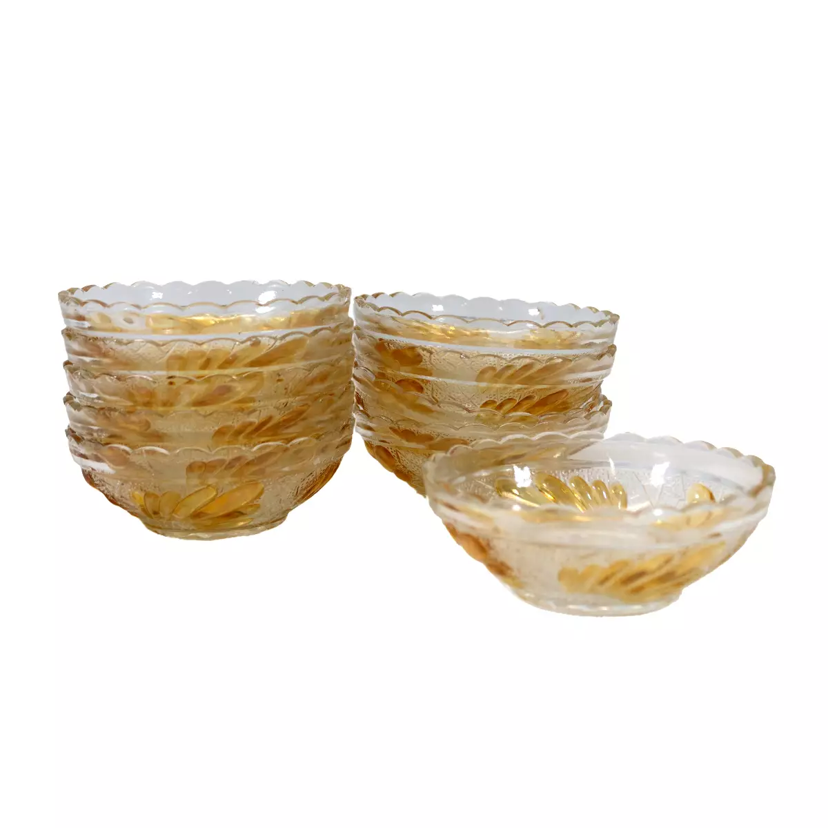 Lasikulhot, joissa keltaisia/meripihkan värisiä lehti- tai kukkakuvioita. Yhteensä 10kpl Korkeus n.4-5cm Halkaisija n.13cm