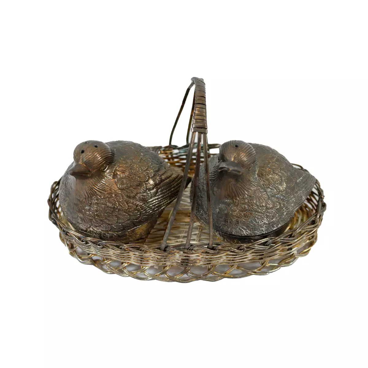 Lintu, sirottimet korissa Pippuri-ja suolasirottimet Korkeus: 6cm (linnut) Leveys: 9cm (linnut) Korin pituus: 16cm Korin halkaisija: 9cm