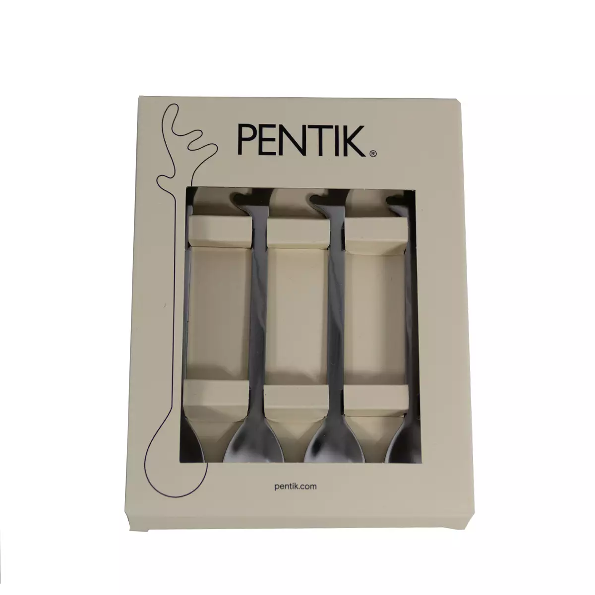 Pentikin valmistama pakkaus, joka sisältää ruostumattomasta teräksestä valmistettuja lusikoita 4 kpl.