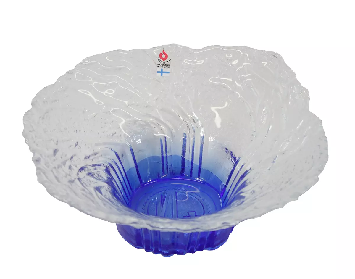 Tekijä: Metsälän taidelasisepät, Lasilandia Valmistettu Suomessa Korkeus: 11,5cm Leveys: 26,5cm Väri: Sininen/kirkas Materiaali: Lasi