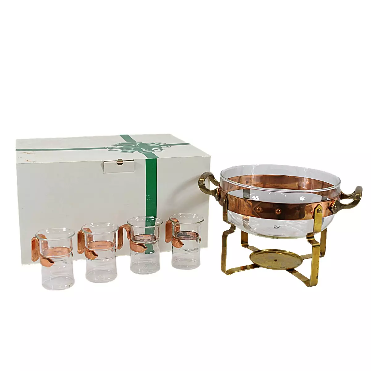 Nilsjohan Sweden, glögisetti, kulho ja 4 lasia Maljan alle saa lämpökynttilän, yhdessä lasissa keltaista värjäymää. Maljan halkaisija: 20 cm, korkeus: 15 cm Lasien halkaisija: 5,5 cm... Lue lisää