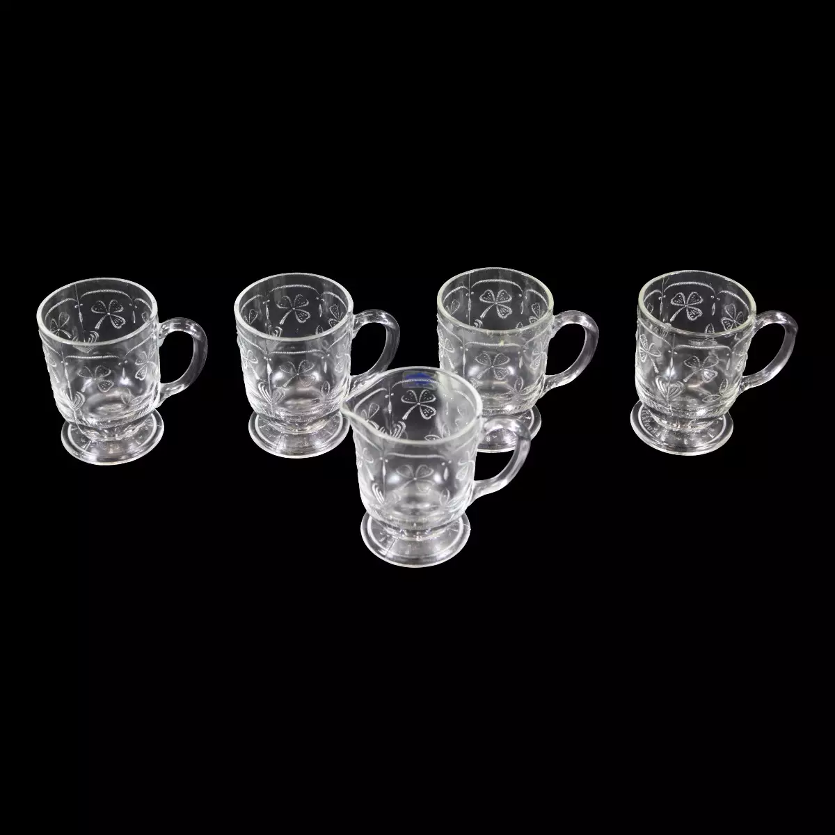 Nuutajärven Apila -kermakko ja 4 lasia Kermakko: Korkeus 8 cm, halkaisija 6 cm. Lasit: Korkeus 8 cm, halkaisija 6 cm.