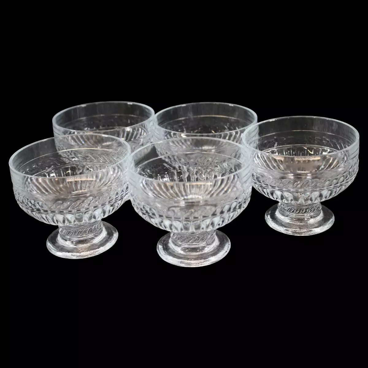 Olga -jälkiruokakulhot, 5 kpl Valmistaja: Riihimäen lasi Korkeus: 8,5 cm Halkaisija: 10,3 cm Väri: kirkas