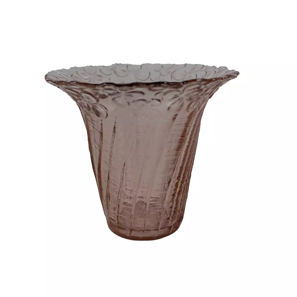 Riihimäen lasin 1980-luvulla tuotannossa ollut vaaleanpunainen orvokki-maljakko. Halkaisija 14cm, korkeus 13cm Materiaali: puristelasi