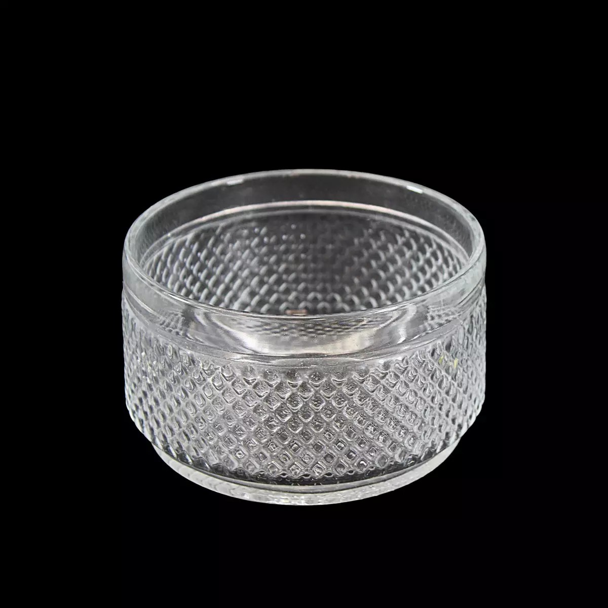 Valmistaja: Riihimäen Lasi - Assi -sarja Korkeus: 6.2cm, halkaisija: 10.2cm Kirkas puriste lasi - salmiakkikuvio Valmistettu 1970-1980 -luvulla