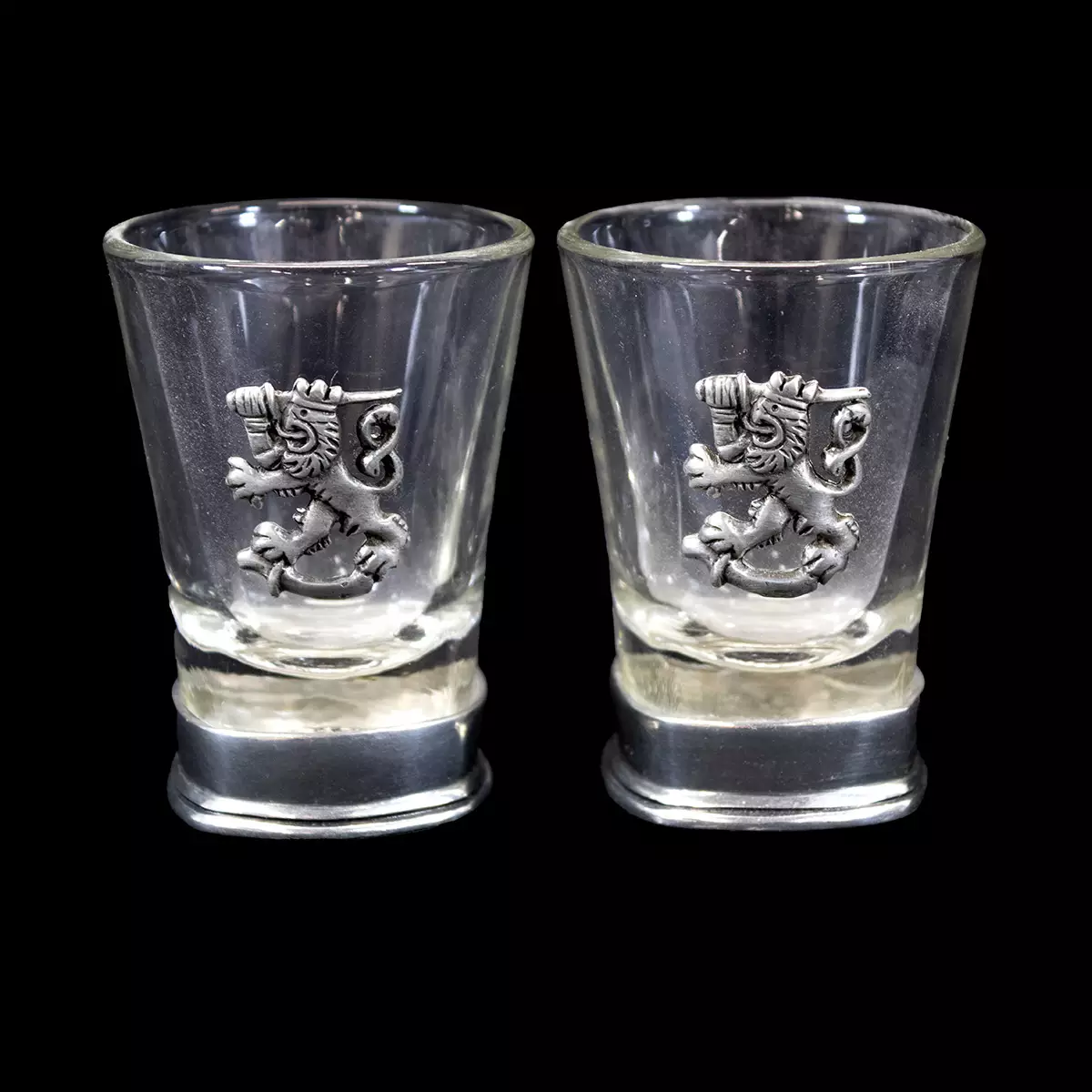 Snapsilasit tinakoristeella ja jalalla. Korkeus 90mm, tilavuus 5cl Suunnittelija Timo Kyllönen