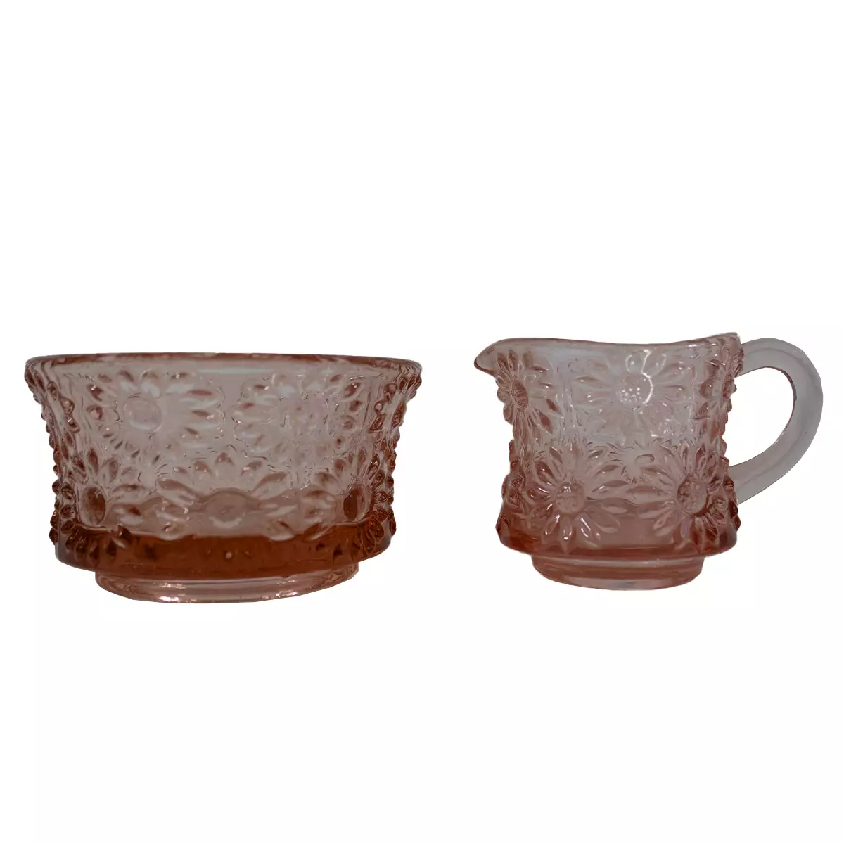 Valmistaja: Tuntematon. Mitat: Sokerikko - Korkeus: 5,5cm, Halkaisija: 10cm. Kermakko - Korkeus: 6cm, Halkaisija: 7cm. Väri: Vaalean/lohenpunainen. Materiaali: Lasi