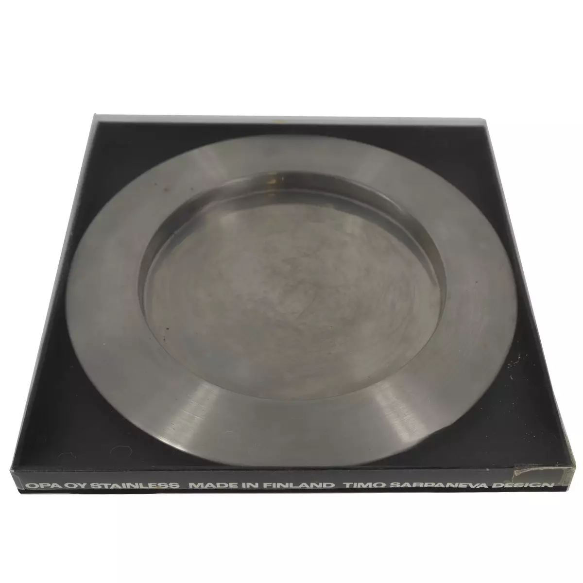 Tarjoiluvati/ -lautanen Valmistaja: Opa Oy Suunnittelija: Timo Sarpaneva Materiaali: Ruostumaton teräs 18-10 Mitat: halkaisija 32cm