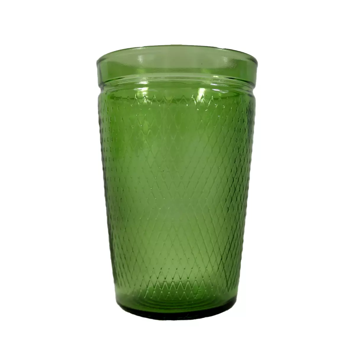 Valmistaja: Karhulan lasitehdas. Suunnittelija: Karhulan lasitehdas. Mitat: Korkeus: 10cm, Halkaisija: 6,5cm. Väri: Vihreä. Materiaali: Lasi