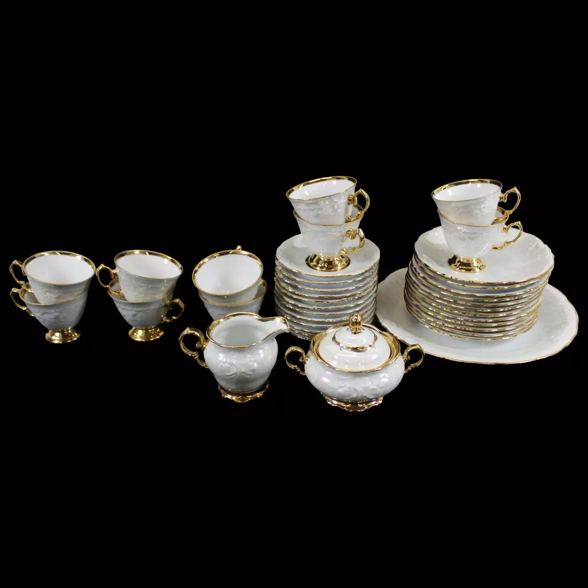 10 Kpl teekuppia 1 Kpl kermakko 1 Kpl tarjoilulautanen 12 Kpl kakkulautanen 12 Kpl asetinlautanen 1 Kpl sokerikko