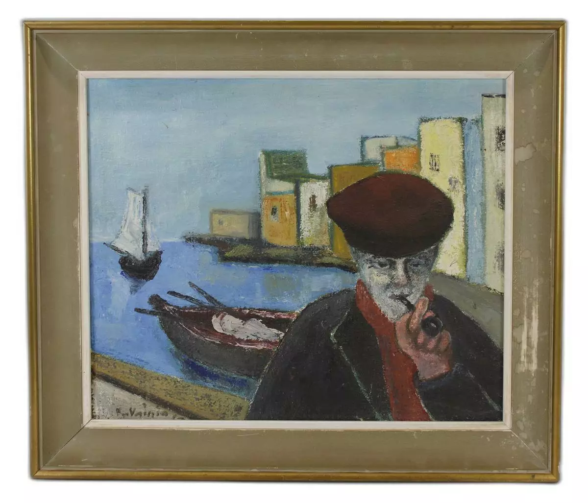 A. Vainion öljyvärimaalaus vuodelta 1963. Kehyksissä värjäymää.