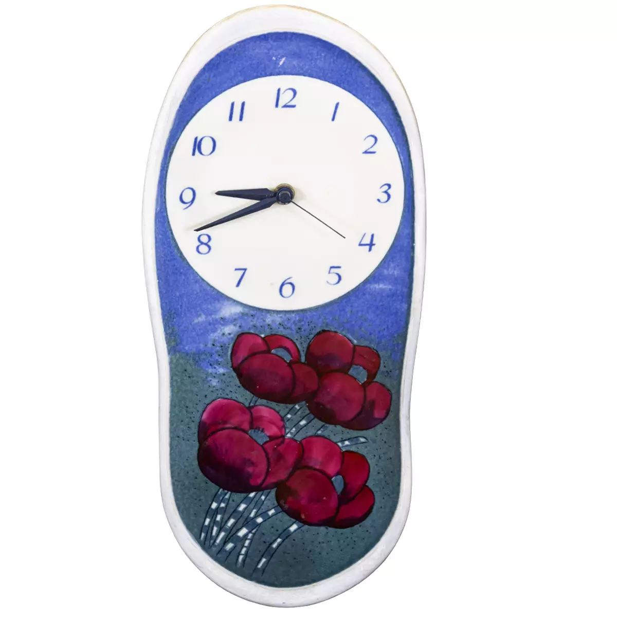 Arabia keraaminen seinäkello Paristokäyttöinen, toimii. Suunnitellut: Heljä Liukko-Sundström Valmistettu vuonna 1984. Korkeus: noin 40 cm Leveys: noin 18 cm