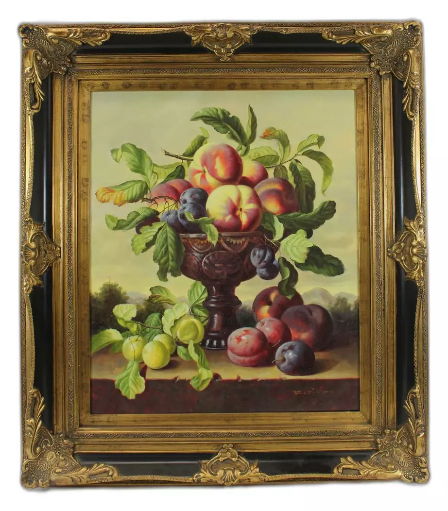 Taulu on kopio Anton Hartingerin "Stilleben mit Pfirsichen und Pflaumen in roter Glasschale" maalauksesta, jolloin itse maalauksella ei ole arvoa, vain kehyksellä