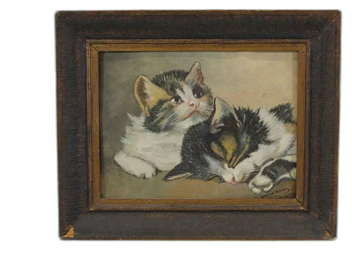 Kissa aiheinen öljy-/pastelliväri teos. Taulussa merkintä Julius Adam, F.P.40. Kehyksissä halkeama ja kaksi maalin lohkeamaa. Mitat: 41 cm x 24cm