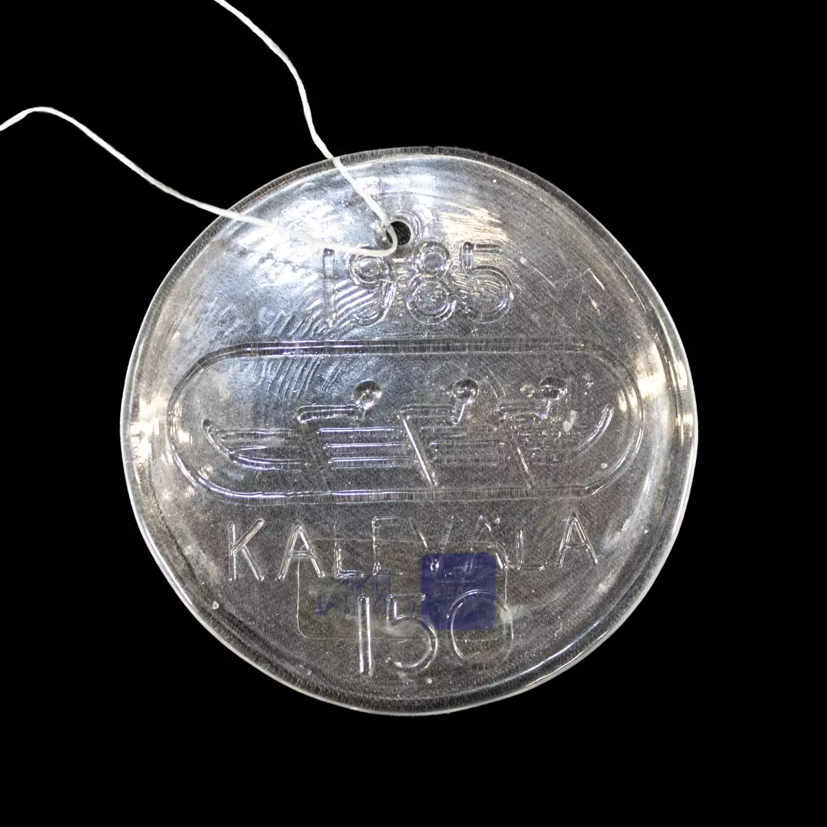 Nuutajärvi/Arabia - Kalevala 150v. lasikoriste/vuosikoriste 1985 Suunnittelija Kerttu Nurminen Valmistettu 1985, kirkaslasi-puristelasi paino 35 g, halkaisija 6,5 cm