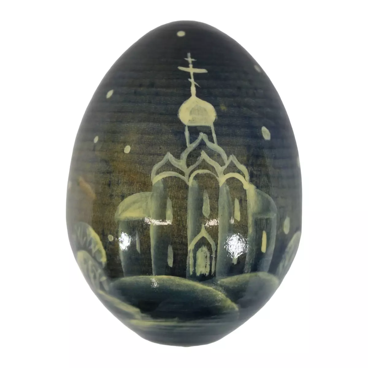 Käsin maalattu venäläinen pääsiäismuna. Korkeus 5,8 cm Talvinen maisema, ortodoksinen kirkko, taloja, siniset sävyt.