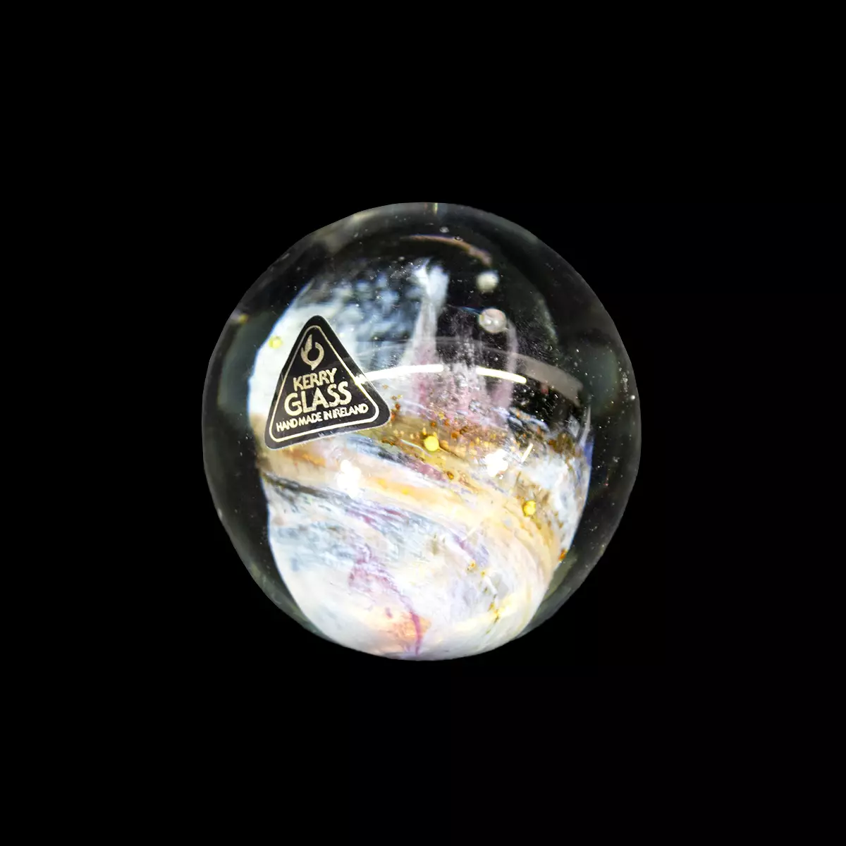 Kerry Glass - paperipaino, käsintehty Irlannissa. Pyöreä lasiesine, jonka sisällä violetin ja valkoisen sävyinen kierre kuvio. Musta tarra tekstillä "Kerry Glass" ja "Handmade in Ireland"... Lue lisää