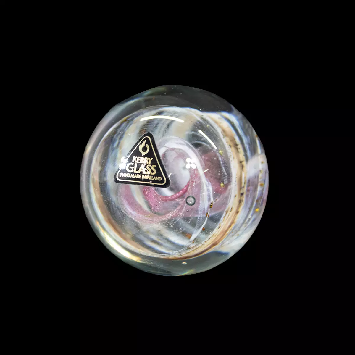 Kerry Glass - paperipaino, käsintehty Irlannissa. Pyöreä lasiesine, jonka sisällä violetin ja valkoisen sävyinen kierre kuvio. Musta tarra tekstillä "Kerry Glass" ja "Handmade in Ireland"... Lue lisää