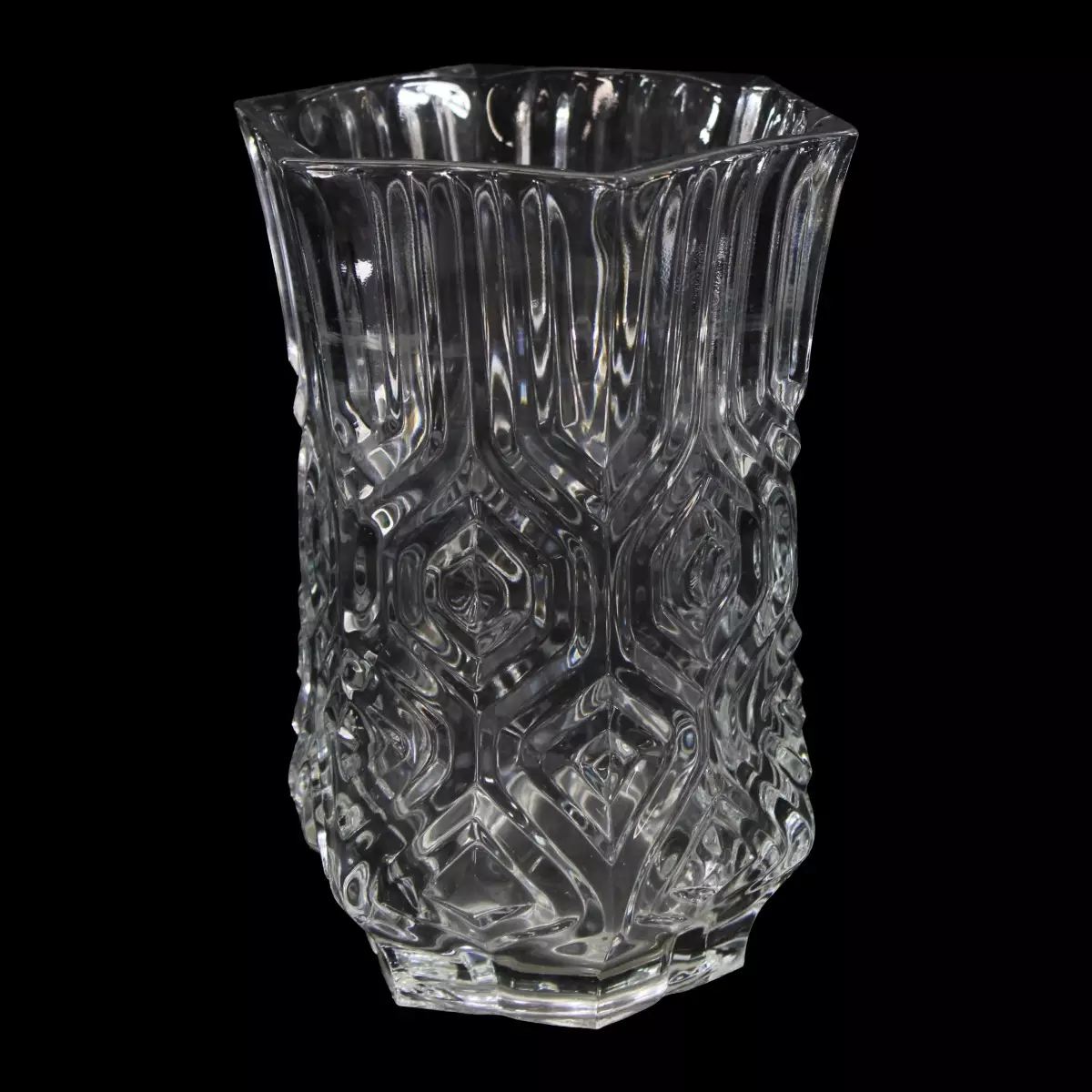 Kristalli maljakko Mitat: 13cm Halkaisija, 20cm korkeus Kirkas. Geometrinen kuviointi. Pohjassa lukee "France".