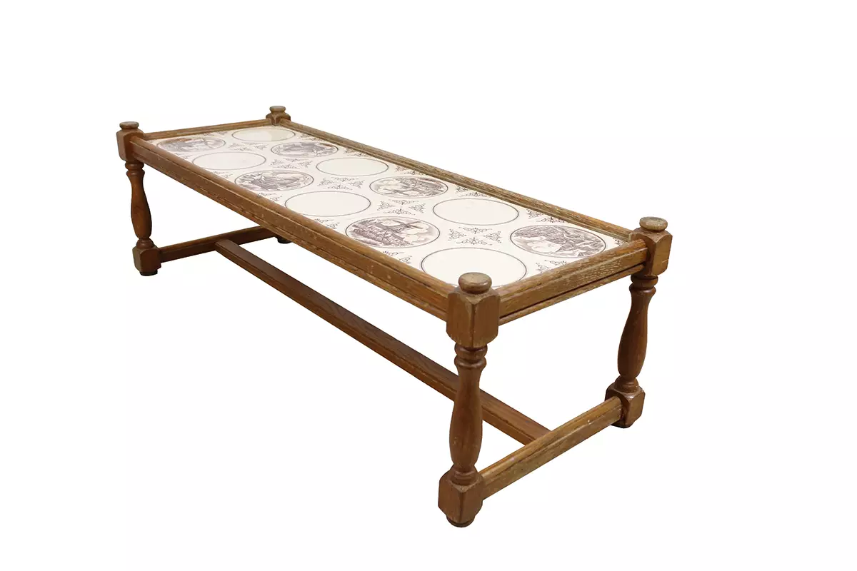 Kukkapöytä, jonka päällinen koristelu laatoilla, runko puuta. Puuosissa pinnan kulumaa. Leveys: 90cm Korkeus: 24cm Pituus: 35cm