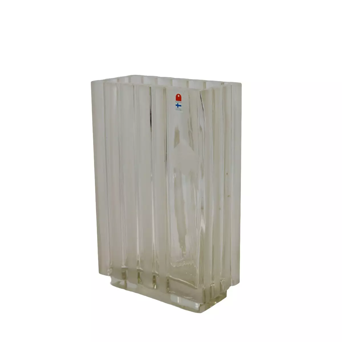 Kumela maljakko Läpinäkyvä, "M" merkintä edessä. Leveys: 18 cm Korkeus: 28,5 cm Syvyys: 8,5 cm
