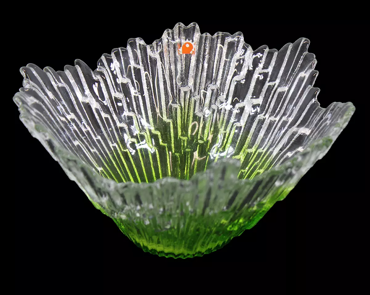 Nimi: Revontulet Suunnittelija: Tauno Wirkkala Valmistettu Humppilan lasitehtaalla Väri: Vihreä/kirkas Materiaali: Lasi Leveys: 22,5cm Korkeus 12,5cm ( Lasikulhon pohjan sisällä... Lue lisää