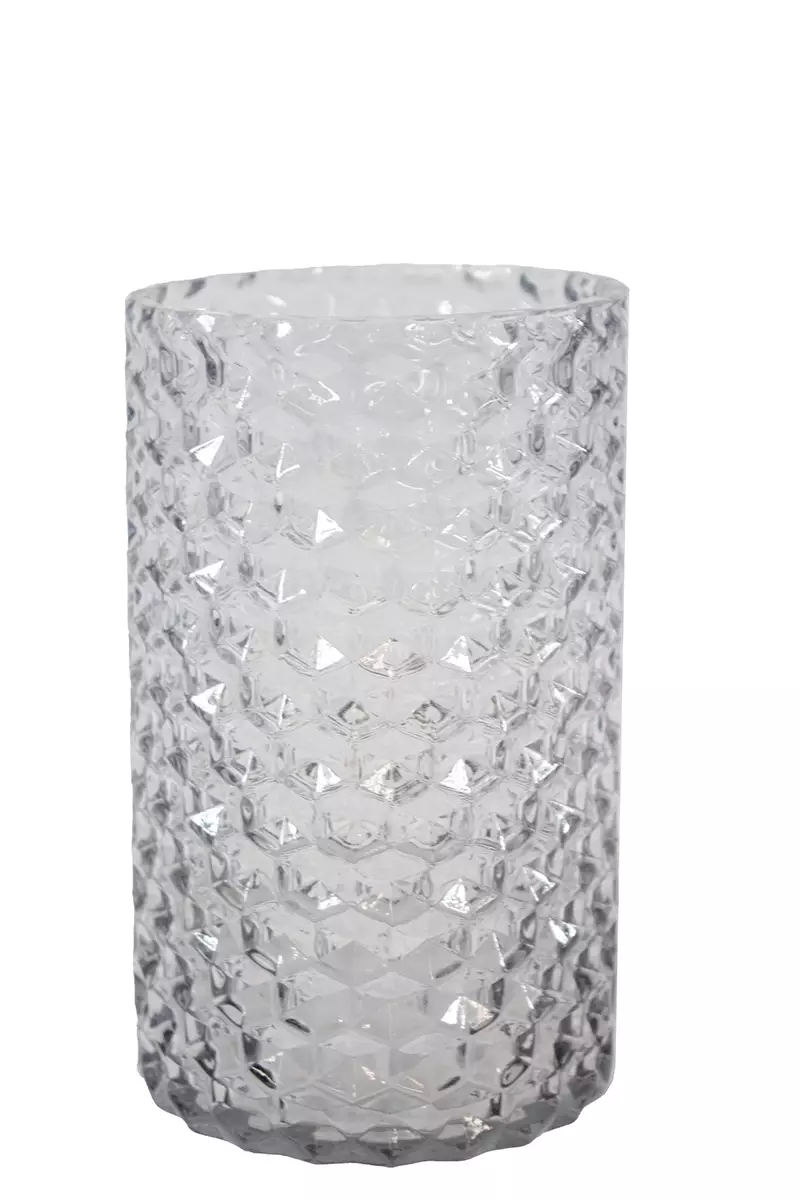 Kuvioitu lieriön muotoinen lasimaljakko. Lasi taittaa hieman harmaaseen. Korkeus: 18cm Halkaisija: 10,5cm