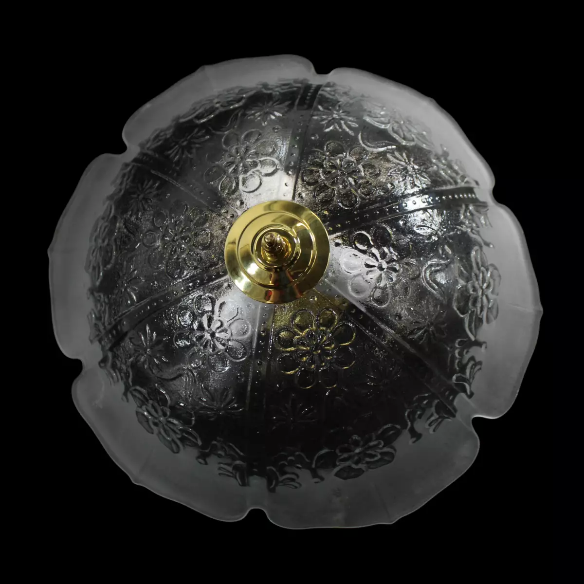 Kirkkaasta lasista valmistettu kukkakuviollinen kattovalaisin kolmella polttimolla. Osa lasista on hiottua lasia. Messinkiset koristeet ja kattokupu.