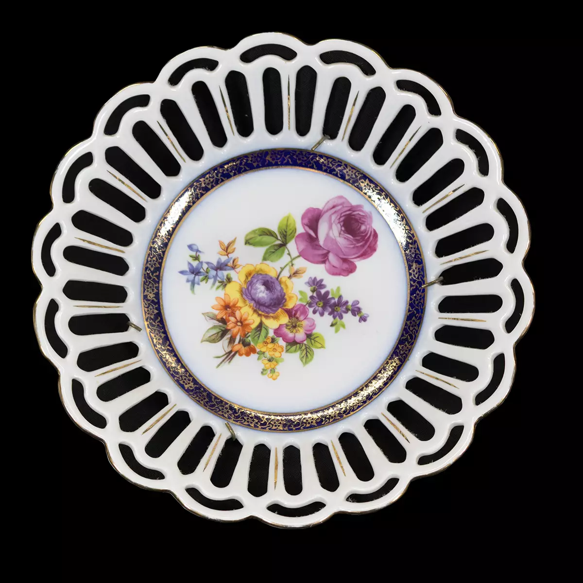 Vintage Martinroda saksalainen posliinilautanen. Keskellä kaunis kukkakuvio, reunat kauniit "pitsimäiset" yksityiskohdat.